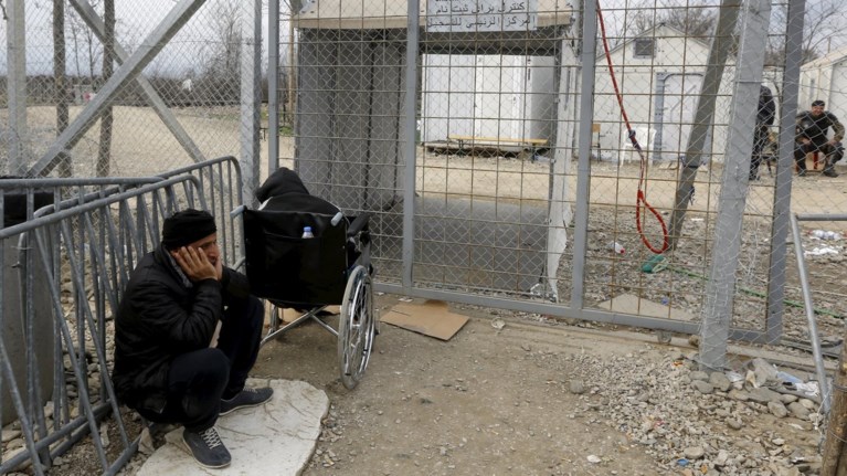 Stranded wheelchair-bound Zhino Hasan, 17, and her father Sarkawt are seen in front of the closed Idomeni border gate, hoping that FYROM would relent and allow her and her family to resume their northward trek through the Balkans to Germany February 26, 2016. Her father, Sarkawt, wheeled her there at daybreak on Friday, hoping to get a headstart in the queue whenever the border Greece shares with FYROM in the small community of Idomeni reopens. The Hasan family, Iraqi Kurds from Kirkuk, are among at least 20,000 refugees and migrants trapped in Greece following successive border shutdowns along the Balkan route used by refugees to reach wealthier European nations. Strapped in and wearing no shoes, Hasan is handicapped and unable to speak. When it started raining, her family covered her with plastic bags. REUTERS/Yannis Behrakis